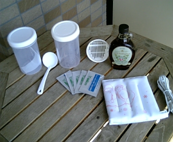 計量保存カップ、スプーン、フィルタホルダ、メープルシロップ、種菌×10、保温パッド後コーヒーフィルタです。