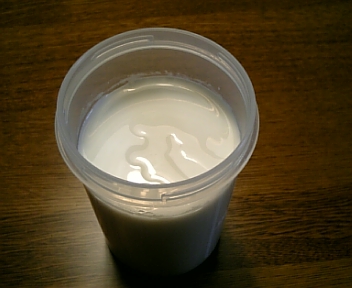 計量カップに500CCの牛乳を入れ、種菌を振り入れたら後は保温パッドを巻いて24時間待つだけで完成。