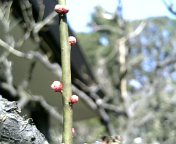 写真左:深大寺境内の釈迦堂階段脇にある梅の木。もうつぼみが膨らんでいます。