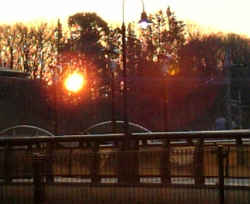写真は、朝の散歩でまわる公園の小山の向こうに昇る朝日です。